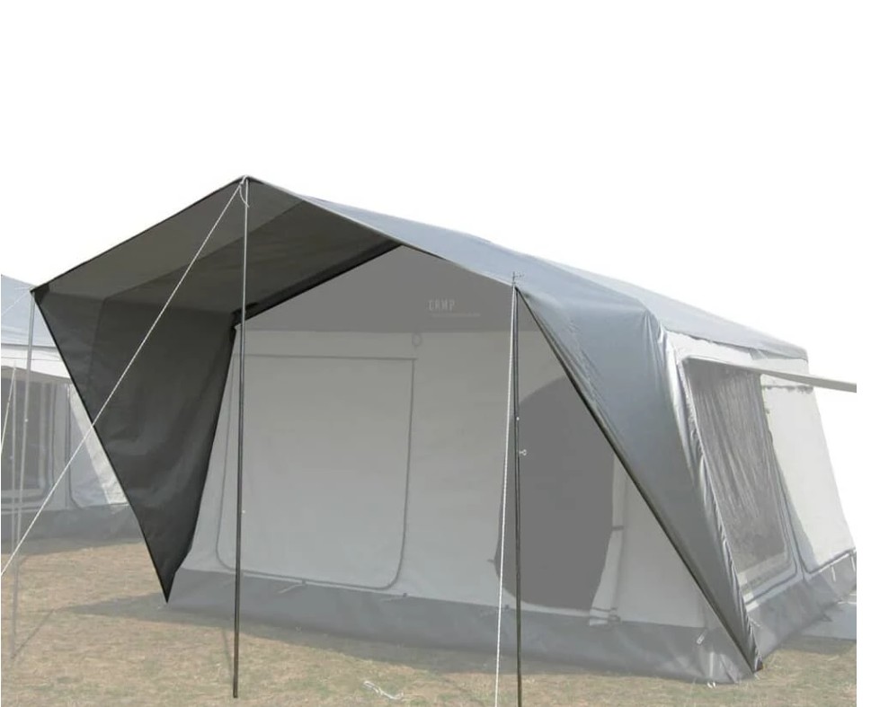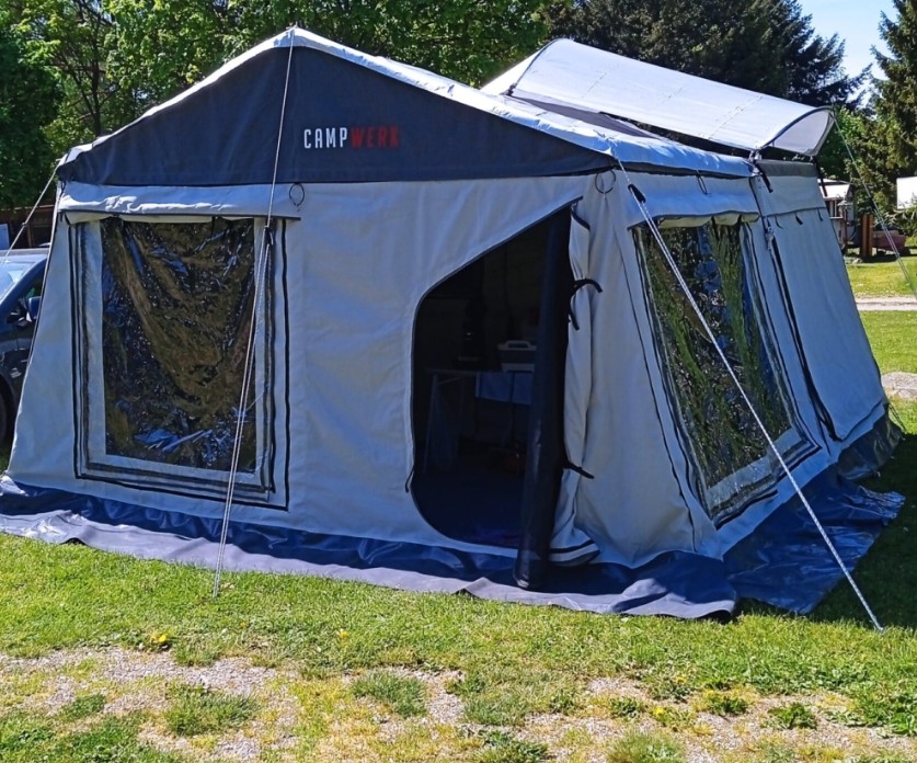 Vorhanden ist ebenfalls ein Vorzelt inkl. Vorzeltboden Seitenwänden und das Sonnensegel.