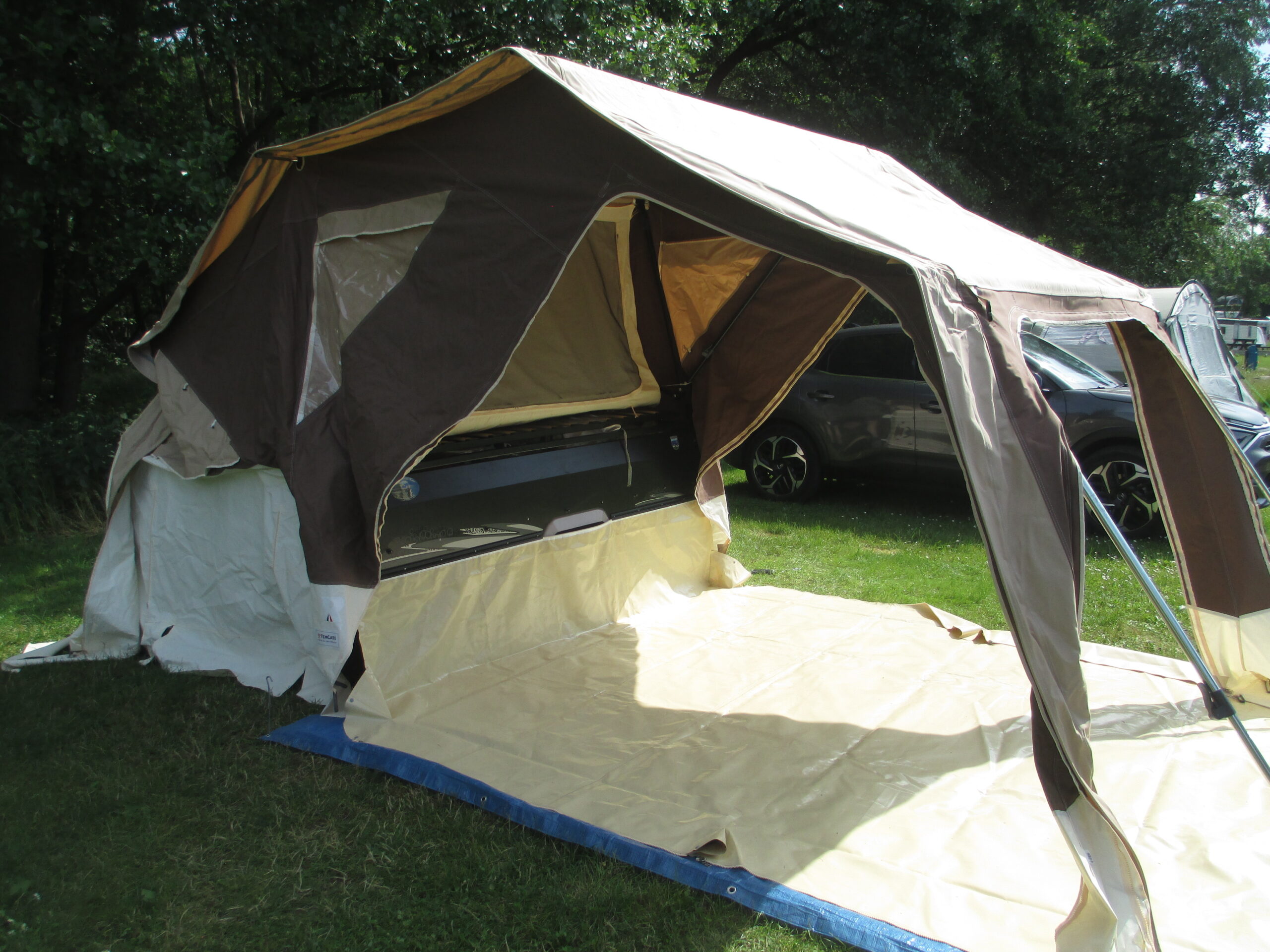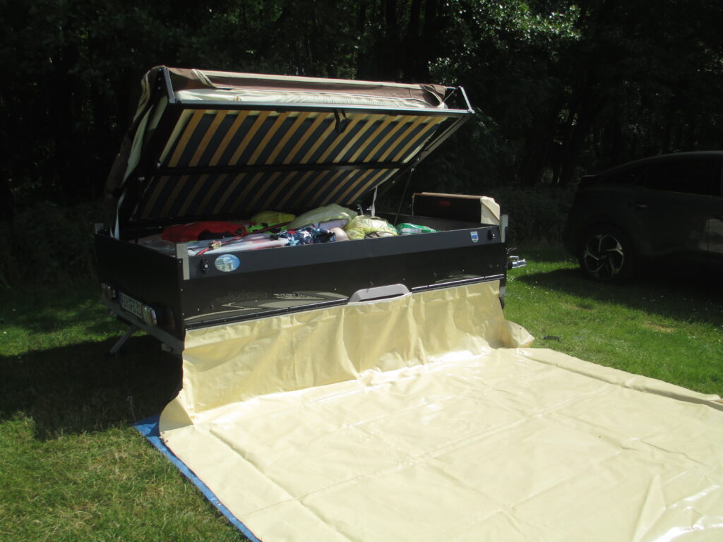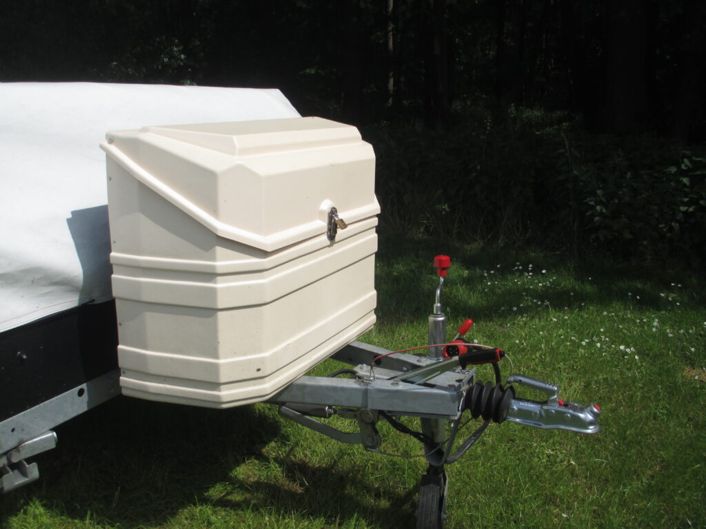 - Auf Deichsel befindet sich riesiger Stauraum, der auch im aufgebauten Zustand komplett nutzbar ist (z. B. für Gasflasche und Werkzeugkoffer)